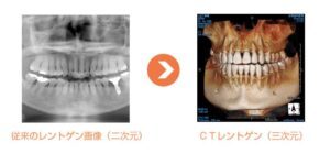 たとえば歯科用CTを使用すると、顎の骨の厚みや高さ、神経や血管の位置を立体的に確認できるため、安全なインプラント埋入位置を事前に把握することが可能になります。
