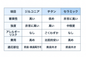 たとえばチタン製は強度に優れ奥歯に適しており、ジルコニア製は白色で審美性に優れているため前歯に選ばれることがあります。